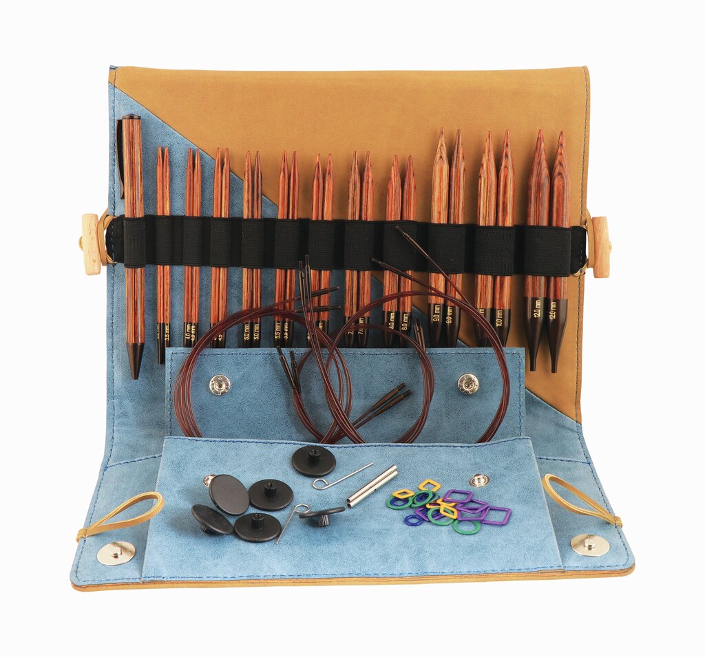 Ginger Deluxesett 3,5-12 mm er et omfattende og kjempesmart sett med utskiftbare strikkepinner i 11 størrelser og tilbehør. Settet består av utskiftbare pinner i normal lengde, og inneholder derfor ikke 40 cm kabel. 40 cm kan kun benyttes til korte utskiftbare pinner, eller spesial som den lengden også kalles.