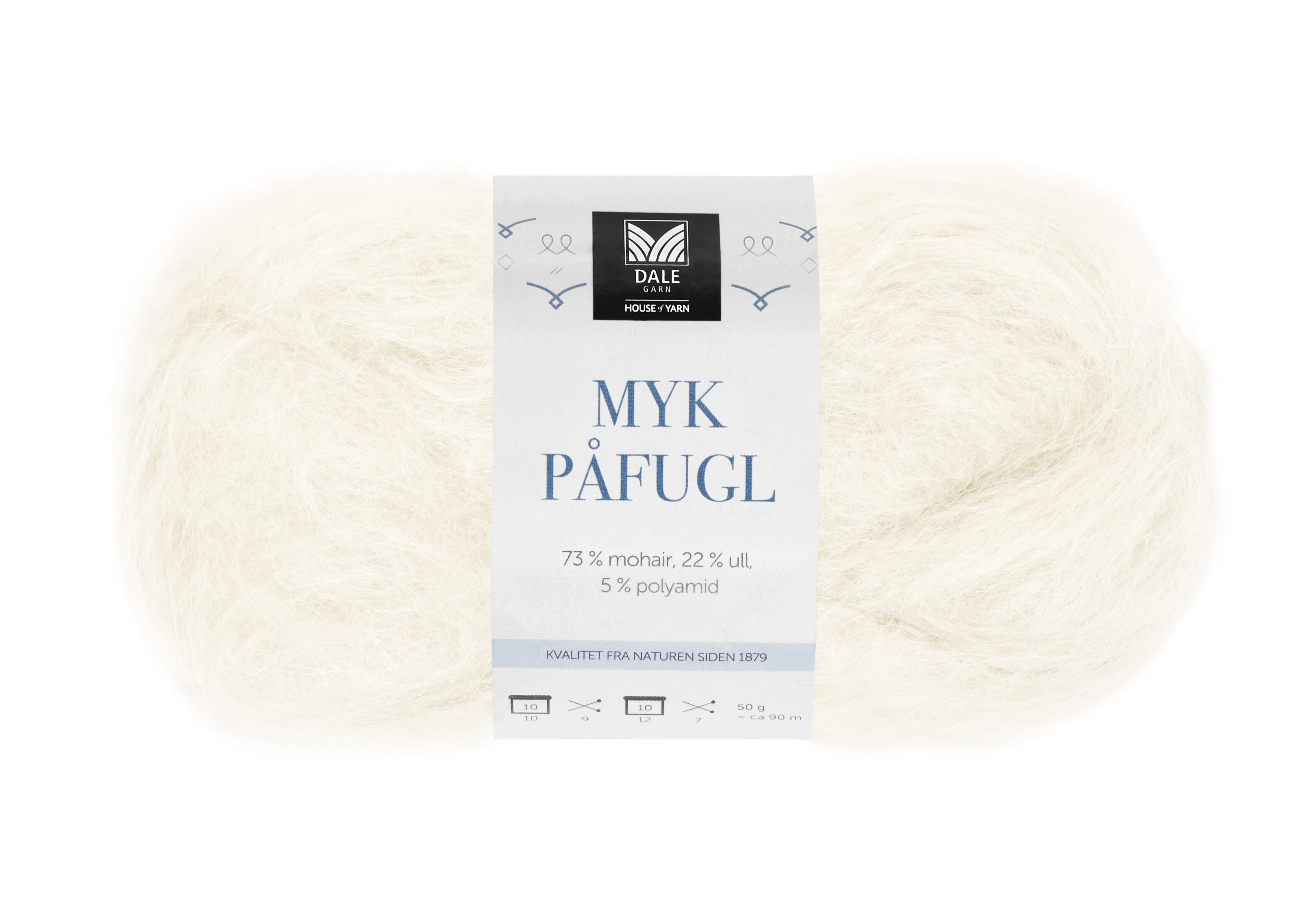 Myk Påfugl er et eksklusivt og mykt, langfibret, børstet mohairgarn. Dette gir superlette og luftige plagg som er elastiske, ikke siger og holder fasongen perfekt. Vi anbefaler Myk Påfugl til alle typer trendstrikk, oversized gensere, jakker og flott tilbehør til både voksne og barn.
