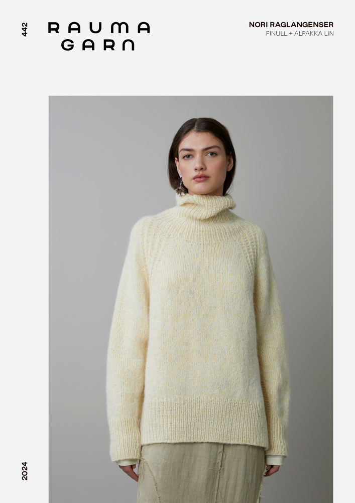 Beskrivelse Nori raglangenser er en romslig og deilig genser som passer til det meste. Den har høy hals, splitt i hver side, og en bred raglan med et strukturmønstret parti som fortsetter videre ned langs sidene på bolen, og under ermene. Genseren strikkes ovenfra og ned med raglanøkninger. Plaggets mål (cm) X Small Small Medium Large X Large XX Large 3X Large Brystvidde 111 116 121 130 135 140 149 Hel lengde foran 61 63 65 67 69 71 73 Ermelengde 46 46 46 47 47 47 48 Garnmengde (gram) X Small Small Medium Large X Large XX Large 3X Large Finull - Kremgul - 4095 300 300 350 350 400 400 450 Alpakka Lin - Hvit - 811 300 300 350 350 350 400 400 |